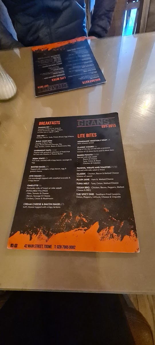 Introducing Grans, a delightful culinary gem located at 42 Main St, Toomebridge, offering an extensive breakfast menu that caters to all tastes. Their Famous Fry stands out, alongside customizable options like Build Your Own breakfasts and nutritious Overnight Oats. Don't miss the tempting Breakfast Bagels or the savory Scrambled Eggs on toast, prepared with care and quality ingredients.